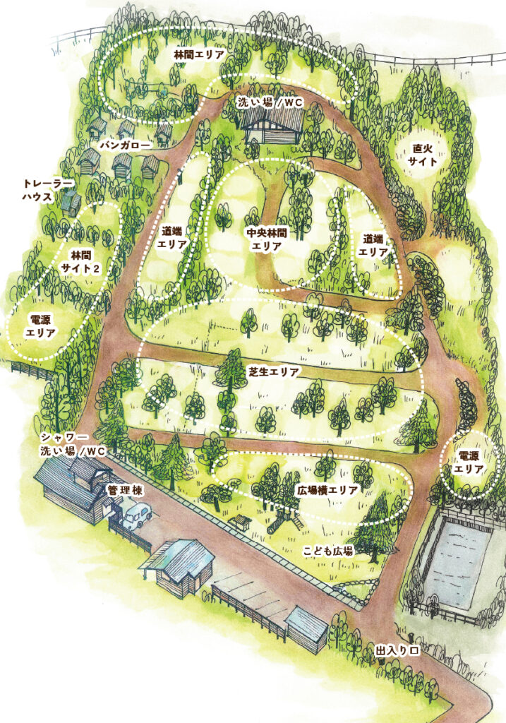 場内入ってすぐのところにある大きな広場に面したキャンプサイトです。キャンプサイトから遊具や広場が見渡せるので、小さな子どもをお連れのお客様に人気のエリア。ファミリーキャンパーさんのリピート率の高いキャンプサイトです。