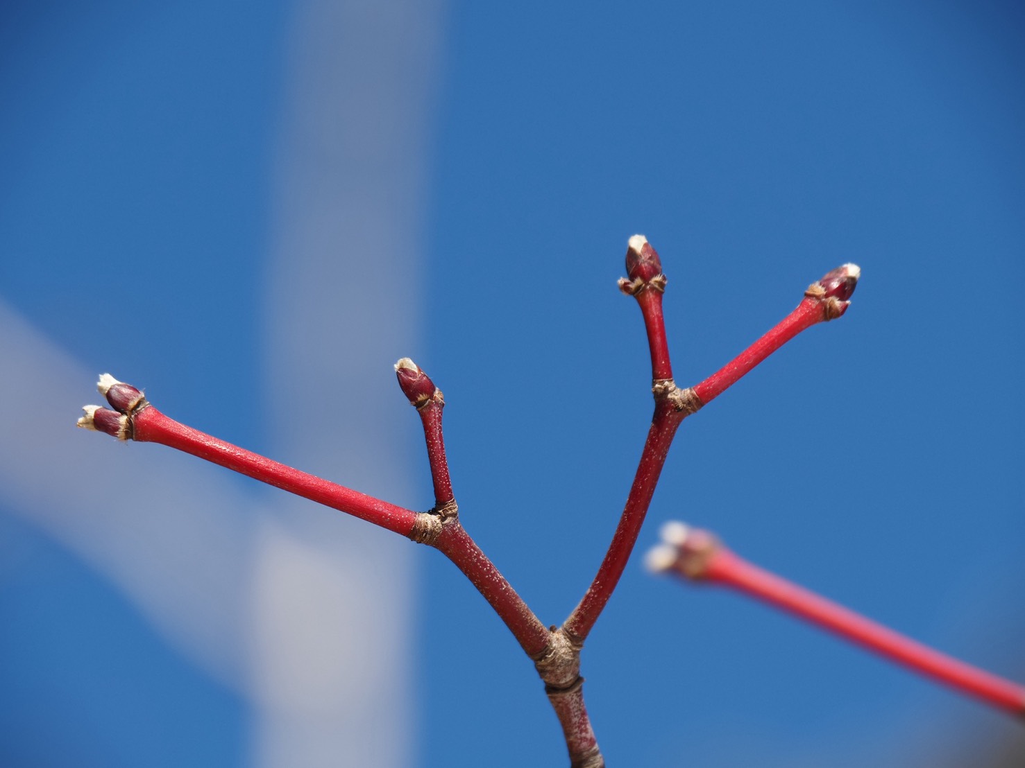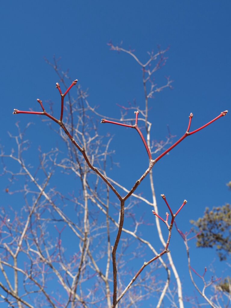 場内の木々はまだまだ茶色一色の木ばかりなのですが、ふっとモミジを見てみると枝が赤くなっていて、しかも先っちょにある芽が少しだけ開き始めているのを発見。