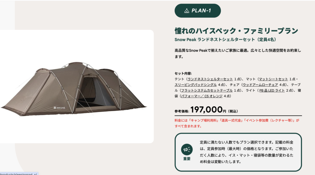 ソロ・デュオで96,000円〜ファミリーだと20万円前後と、パッと見の金額は結構な金額に見えてしまうかもしれませんが、どれもプラン最大定員の時の料金。人数が減る(最大定員4人計算→3人家族であればチェアや寝袋などが減る)と料金はもう少し低くなります。
