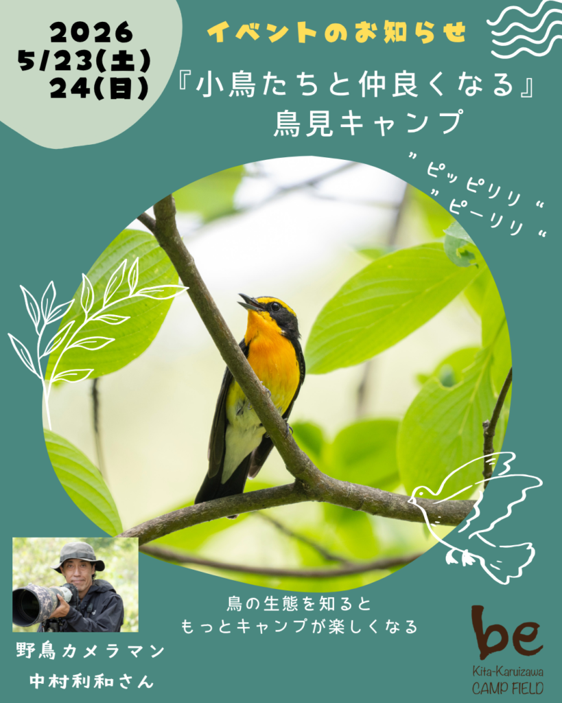 今年からbeのフィールドや北軽井沢周辺の自然環境を活かしたイベントを開催します。各回ごとにテーマを設けますが、どれもみなさんのキャンプがもっと楽しくなったり、キャンプやアウトドアの魅力を深掘りしていくような内容です!